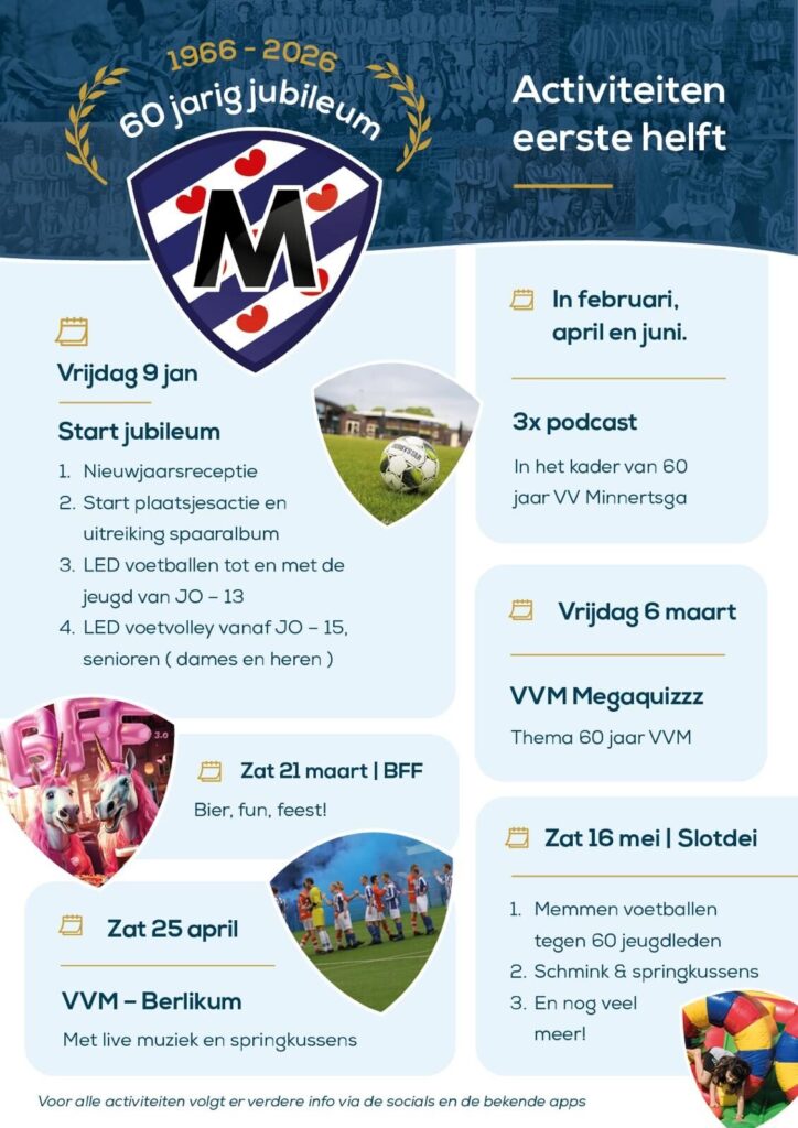 VV Minnertsga jubileum 2026 Warming up Voetbalvereniging Minnertsga is opgericht in 1966 en bestaat volgend jaar dus 60 jaar. De vereniging is de afgelopen jaren gestaag gegroeid naar bijna 270 leden en zo’n 200 vrijwilligers en is het bruisende hart van het dorp Minnertsga. Deze mijlpaal van 60 jaar moet natuurlijk gevierd worden. Er zijn […]