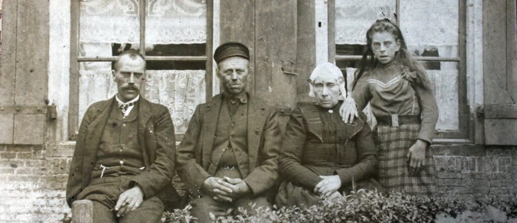 Als je met zoveel foto’s in de weer bent dan is het zaak om al die foto’s goed te documenteren: beschrijven wie er op staan, waar is de foto gemaakt en op welke datum, en wie heeft de foto ingestuurd en waar is bijvoorbeeld en origineel van de foto te vinden. Dat kost veel tijd maar alleen op die manier kunt je foto’s makkelijk en eenvoudig terugvinden. De foto’s die in de beeldbank staan van Minnertsga vroeger, zijn goed gedocumenteerd. Maar er staan bij mij ook nog veel foto’s op de harde schijf die summier zijn beschreven. Met die foto’s worden nu ook vorderingen gemaakt en zullen ook nog in de beeldbank worden geplaatst. Sinds vorig jaar maak ik ook gebruik van een computer programma dat gezichten kan herkennen. Zo laat het programma foto’s zien op het scherm met overeenkomstige gezichten. Dat is mooi want op die manier kun je nog meer foto’s nauwkeurige documenteren. Zo werden door het programma ook deze twee foto’s geselecteerd. De gezichten op de foto’s in het vorige verhaal over Muller, Wetterauw en Hibma, had ik aangemerkt met de namen en even later toonde het programma deze twee foto’s met naamsuggestie. En warempel, duidelijke herkenbaarheid. De persoon rechts werd door het programma herkend als Jacob Muller (1876-1945). De gelijkenis is overduidelijk. De man en vrouw in het midden zijn naar alle waarschijnlijkheid zijn ouders Johannes Hendriks Muller (1850-1927) en Jetske Johannes Schotanus (1848-1925). De jonge dame rechts zou Jacob zijn jongste zuster Pietje (1889-1950) kunnen zijn. Op de andere foto werden Hendrik Muller en Sijbrigje Wetterauw herkend door het programma omdat de gezichten van die twee mensen ook al in de database zaten. Het is het gezin van Hendrik Muller (1871-1953) en Sijbrigje Wetterauw (1871-1949) met hun kinderen Pietje (1904-1984) en Johannes (1910-1990). Met behulp van het computer programma hebben zijn nu ook deze twee foto’s gedocumenteerd.