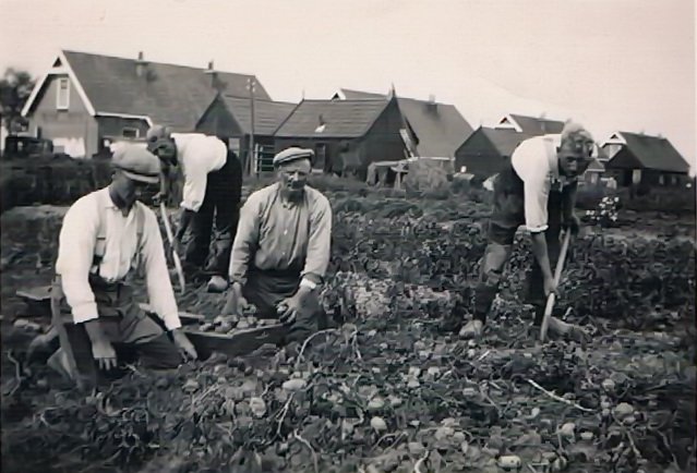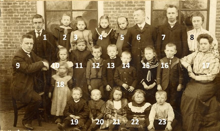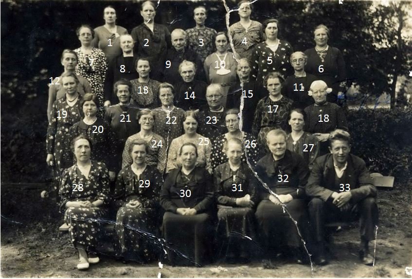 Van een collega kreeg ik onlangs een paar oude foto’s uit de nalatenschap van Jacob Pieters Herrema (1864-1926) en Jintje Sijtses Douma (1866-1943). Maar . . . . . . net zoals bij zoveel foto’s: wie staan er allemaal op? Slechts twee namen zijn bekend; de vrouw rechts met oorijzer is Jintje Sijtses Herrema-Douma (18) en de tweede van links op de voorste rij is haar dochter Jantje (29). Wie zijn de andere dames en heer? Klaaske Spoelstra, vv Hein Stellingwerf (melkhandelaar) Fokje Miedema, vv Andries Vrieswijk IJTje Dijkstra, vv Cornelis Vrieswijk Willemke Kikstra, vv Lou Bijlsma Klaske Oberman, vv Ane Reitsma Anne Winsemius, vv Gauke Reitsma Hendrikje de Jong, vv Jan de Valk Mieke ?, vv Albert Ketellapper Lieuwkje Westra, Johannes Posthumus Nieskje, vv Herke Meersma Baukje Engga, vv Kornelis Wijngaarden Willemke Lautenbach, vv Anne Stellingwerf Janke Homsma, vv Sjoerd Bekius Janke ?, vv Douwe de Jong Reintje ?, vv Jan Bruinsma overbodig nummer Maartje Heeringan, vv Rinse Terpstra Jintje Sijtses Douma 1866 – 1943, vv Jacob Pieters Herrema Anne ?, vv Rein Feenstra Sybrigje Bekius Wypkje Posthumus, vv Loepke Visser Jitske Bekius, vv Bote Posthumus Jikke Joostema, 1870 – 1961, vv Rients Baukes Tuinhof (of Cobe vv Jan Bosse volgens boekje zie hieronder) Afke Boersma, vv Sjoerd de Groot vrouw van Ds. G. Brouwer (Gerf. predikant 1934-1945) Gorsina van den Voren – Grootenboer, vv burgemeester B. Anema Cornelia van Dijk, vv Jan Doekes Bekius Hijke Fortuin, vv Hilbrand Dijkstra Jantje Herrema 1889 – 1946, vv Sjoerd Swart Trijntje Vrieswijk, vv Age Knol ? huishoudster bij Jacobus Zwart Antje Steinfort 1880-1952, vv Johannes Vogel Bartele Kramer, in 1946 vertrokken naar Canada Reacties verwerkt: 04-05-2015: Henny Rondaan-Stallinga, naam nr. 1 04-05-2015: Antje Bosma-Wiersma, naam nr. 32 04-05-2015: Tina Blaauw-Tuinhof, naam nr. 23 en 33 06-05-2015: Henny Rondaan-Stallinga, naam nr. 1 aangevuld 25-05-2015: Overige namen overgenomen uit Minnertsgea lykas it wie en nea wer wurde sil, blz. 91 10-11-2015: nr. 7 meisjesnaam De Jong toegevoegd. 21-10-2016: Willem Zuidema, namen 4, 9, 12 en 25 aangepast. 26-01-2019: Abe de Roos, naam 13 aangepast. NB. Dit is de Gereformeerde vrouwenvereniging ‘Wees een Zegen’. Waarschijnlijk is de foto gemaakt tijdens het uitstapje door Friesland op 22 juli 1939 (bron: notulen 6de jaarvergadering 30 november 1939).