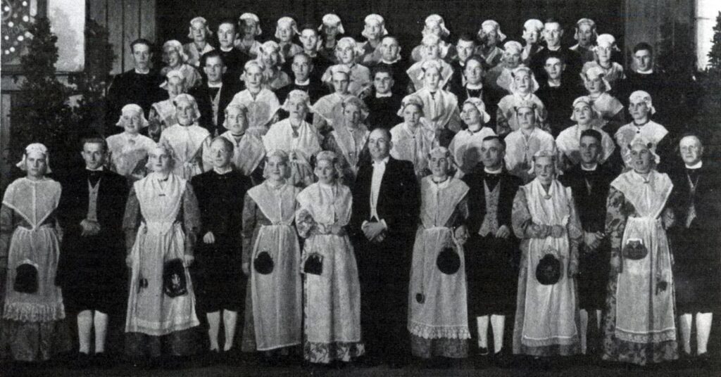 Op Facebook had ik een closeup foto geplaatst van twee vrouwelijke leden van het koor de Fryske Stimmen. Daar kwamen enkele reacties op en daarom is het wel aardig om wat meer van dit koor te vermelden. Onderstaand artikel (behalve de foto’s en de namen) komt uit de Hepkema’s Courant van 19 november 1948. De tekst is qua spelling iets aangepast aan deze tijd. Mochten er nog andere foto’s zijn van dit koor, dan hoor ik dat graag. “God is mijn lied” heet het christelijke zangkoor in Minnertsga. Het bestaat ongeveer 20 jaar nu en telt 55 leden, 25 dames en 20 heren. Verdere antecedenten: het zingt in de afdeling uitmuntendheid en wordt geleid door de hoogst bekwame dirigent Binnert Posthuma. Hiermee zou de kous af zijn, maar dat is het niet. Het koor is namelijk ontdekt door de radio: er is contact gekomen tussen de NCRV en “God is mijn lied”, dat op 21 april van dit jaar aan een steravond van deze omroepmaatschappij in Leeuwarden meewerkte, waarbij alle zangers in (gehuurde) Friese kostuums waren gestoken. Dit optreden ging er in als koek, vandaar dat de NCRV nu met de Minnertsgaasters in zee is gegaan voor een tournee door ons land, die 30 avonden omvat. Deze foto is gemaakt in 1947. Bovenste rij vlnr: Neeltje Joostema, Welly Burry, Hiltje Joostema, Riemke Elzinga, Tine v.d. Schaar, Liskje v.d. Ploeg, Riemke v.d. Schaar, Griet Posthuma en Sietske Burry. Tweede rij: Gerrit Elzinga, Tine van Leeuwen, Piet Elsinga, Jantje Dijkstra, Gerrit Glazema, Wally Joostema, Wietske de Vries, Gepke Smits, Klaas Andringa, Maartje Terpstra, Berend Zijlstra en Feikje Elsinga. Derde rij: Cornelia Jager, Goffe S. Elsinga, Sietske Miedema, Tjepke Smits, Geppy Faber, Piet Krol, Akke Winsemius, Hein van der Mey, Annie Smits, Tjerk Elsinga, Froukje v.d. Schaar en Klaas de Haan. Vierde rij: Idske Wijnja, Betje Wijngaarden, Eke Dijkstra, Anneke Hollenga, Rinske Jager, Antje Posthumus, Maartje Glazema, Griet Kuzema, Janny Terpstra en Klaske Norder. Voorste rij: Klaske Faber, Kobus Faber, Cornelia Hamer, Henk Woudstra, Aaltje Tjallingii, Jantje Faber, dir. Bindert Posthuma, Afke de Groot, Ale Traivaille, Pietje Jensma, Klaas Hamer, Trynke Elsinga en Jouke Jouwersma (namen van K. de Haan, P. Hengst-Jensma en K. Hamer). Aan een dergelijke vocale trektocht zit onnoemlijk veel vast. In de eerste plaats zijn de leden van het koor stuk voor stuk mensen, die de hele dag hun werk hebben in allerlei prozaïsche beroepen en er maar niet zo maar eventjes uit kunnen lopen om ergens in den lande aan een steravond mee te werken. Toch is hiervoor een oplossing gevonden, wat al een kranig organisatiestukje mag heten. Voorts was er het probleem van de geadoreerde kostuums. Huren of zelf kopen? Na veel wikken en wegen besloot men de kostuums te kopen, in zoverre: de vrouw van de voorzitter P. Elzinga knipte alle 35 kostuums voor de dames, die op haar beurt haar spullen in elkaar stikten. Elke heer werd door de kleermaker een broek aangemeten. De mutsen moesten de dames zelf aanschaffen, maar de oorijzers […]
