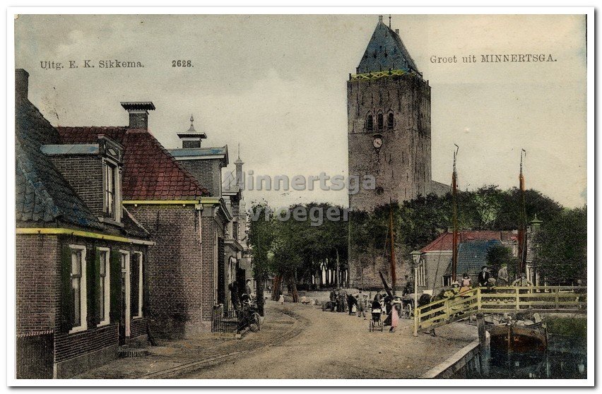 Een paar weken geleden heb ik iets geschreven bij de oude ansichtkaart die door Titia Lindeboom op internet was gevonden. Een prachtig dorpsbeeld uit ver vervlogen tijden. De titel van dat verhaal was: Minnertsga op oude ansichtkaarten (deel 1). Een deel 1 suggereert dat er ook een deel 2 of meer komen. En dat had ik in het vorige verhaal dan ook beloofd. Ik had beloofd om een paar stappen richting het bruggetje ‘it heechhout’ te maken om het wat dichter bij te bekijken. Daarvoor heb ik twee mooie foto’s uitgezocht. De bovenste foto is één van de oudste fotoprentbriefkaarten die ik in mijn collectie heb. Dit dorpsbeeld is rond 1900 door de fotograaf vastgelegd. Gelet op het perspectief van de foto, heeft de fotograaf waarschijnlijk zijn grote fotocamera op een schip neergezet en heeft hij dit sfeervolle beeld op de lichtgevoelige glasplaat vastgelegd. De foto is haarscherp. Wat zien we? In het oog springend is natuurlijk de loopbrug, it heechhout zoals die in de volksmond werd genoemd. Dit was de verbinding van de Meinardswei naar de Tsjillen. Links staat Grietje Koopmans in de deuropening. Zij ventte vroeger met bakkerswaren in het buitengebied van het dorp. Zij had dan twee korven aan een juk hangen dat op haar schouders rustte. Zo liep zij uren achtereen om bakkerswaren voor de plaatselijke bakker te verkopen om zo een klein inkomen te vergaren. De kinderen op de voorgrond komen regelrecht uit boek Ot en Sien zo lijkt het wel. Tussen de manspersonen staat een hondenkar met maar liefst vier trekhonden er voor. Op de kar staan twee flinke houten vaten. Vermoedelijk is de eigenaar van de hondenkar een zekere Meindert Hamersma die met melk ventte. In het tweede pand rechts had Gelbrichje Miedema-Tuinhof een kruidenierswinkeltje en in het derde pand was een bakkerij gevestigd waar verschillende bakkers de oven brandend hielden. Even verderop is de flapbrug te zien die de Meineardswei met de Tilledyk (toen nog Bosdijk genoemd) verbond. De smalle vaart die onder it heechhout en de flapbrug door liep, kwam uit in de Tzummarummervaart en werd gebruikt door schippers die met pramen de goederen van de landerijen in de omgeving naar het dorp brachten om vervolgens overgeladen te worden in snikken en skûtsjes. Maar er werden uiteraard ook goederen vanuit de dorpshavenkom naar de boerderijen in de omgeving gevaren zoals turven en bouwmaterialen etc. We gaan denkbeeldig voor de bakkerij staan; met de rug naar de flapbrug en dan zien we it heechhout van de andere kant. Een dorpsbeeld uit diezelfde periode. Een kleurenfoto; uit die tijd? Tja, maar wel één die ingekleurd is. Dus het zijn niet de ware kleuren want ik kan mij niet voorstellen dat de dakgoten toen geel werden geverfd. Als je inzoomt op de foto is duidelijk te zien dat de afbeelding is ingekleurd. De druktechniek is de zogenaamde lithodruk oftewel steendruk. Dus geen echte foto zoals de eerste. Links het kruidenierswinkeltje van Gelbrichje Miedema-Tuinhof en dan de steeg die nu veel breder is dan […]