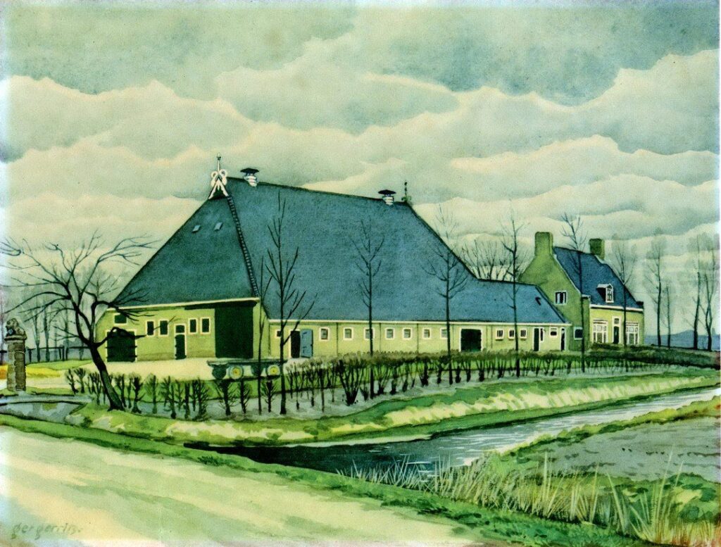 Bij de spullen die we onlangs voor het dorpsarchief hebben ontvangen zat ook een ingelijste afbeelding achter glas van de boerderij Groot Lammema. Deze boerderij ligt aan de Hoarnestreek 9. Om erachter te komen of het een schildering of een gedrukte uitvoering is het lijstje verwijderd. De afbeelding bleek een kleuren afdruk te zijn maar geen foto. Op de achterkant staat een gedrukte tekst over de boerderij. Het lijkt erop dat de afbeelding afkomstig is uit een serie over Friese boerderijen. Het verhaal op de achterzijde volgt hierna. Op het hooggelegen hiem (erf) ligt de state Groot Lammema te pronken in het wijde Friese landschap van de kleibouwstreek ten noorden van Leeuwarden. Deze fraaie boerderij is een treffend voorbeeld van moderne Friese bouwkunst. Het is een bewijs van de gunstige mogelijkheden van het toepassen van de streekeigen hoofdvorm voor nieuwe boerderijen. Het binhuis (kop), dat de gehele woning bevat, is met een lager tussenlid (hals) verbonden met de grote Friese schuur (romp). Het biedt voor dit gemengde bedrijf het voordeel dat de boer zijn koestal altijd binnendoor kan bereiken. In de hals zijn een spoelplaats, een fietsenberging en een melkbewaarplaats ondergebracht. De betrekkelijk kleine koestal voor melkvee, uitgevoerd als een Hollandse stal met voergang, bevindt zich langs de korte voorgevel van de grote schuur op het zuiden. De jongveestal ligt op het oosten. Tegen deze gevel is ook een werktuigenberging gemaakt. De paardenstal ligt tegen de noordgevel, naast de grote inrijdeuren van de schuur. De plattegrond vertoont de kenmerkende indeling van de Friese schuur. De langsdeel, welke hier langs de westgevel ligt, en de middenas, zijn doelmatig gelegen in het midden van de schuur onder de grootste hoogte van het dak. De schuur heeft moderne gelijmde spanten welke tegen het dak staan en op deze wijze de gehele binnenruimte vrijlaten en het onbelemmerd gebruik van de jakobsladder bij het voltassen van de schuur mogelijk maken. De oude boerderij brandde in het jaar 1948 af. Het was een zeer bijzondere state, uitvoerig beschreven door K.J. van den Akker in zijn “Van de Mond der oude Middelzee” uitgave van de Friesche Maatschappij van Landbouw. In het vroegere binhuis, in 1876 tot de helft verkleind, waren later nog aanwezig de groene kamer, de secretarie en de zaal. Waarschijnlijk werd de oude boerderij omstreeks 1775 gebouwd. Met zijn inrijpalen, bekroond met schilddragende leeuwen, zijn singels en zijn grachten, vormde Groot Lammema een indrukwekkend geheel. Het stemt tot dankbaarheid dat de eigenaar de boerderij na de brand zo stijlvol heeft laten herbouwen. Aldus de tekst achterop de afbeelding. Omdat in de tekst wordt gerefereerd aan de brand van 1948, is deze afbeelding van na die tijd. We zullen de afbeelding zorgvuldig bewaren in het dorpsarchief. Lees meer over Groot Lammema: https://minnertsgavroeger.nl/boerderij-groot-lammema-hoarnestreek-9/ https://minnertsgavroeger.nl/google/