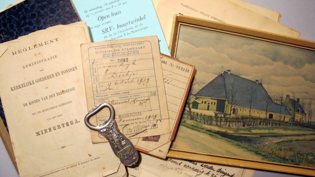 Sinds een aantal weken zijn we bezig met het inventariseren en beschrijven van alle documenten die in de archiefruimte wordt bewaard. In de loop der jaren is veel materiaal ingebracht en zorgvuldig in mappen gedaan. Maar de omvang van de documenten wordt alsmaar groter en snel iets terugvinden wordt dan lastiger. Daarom wordt elk document nu beschreven en ingevoerd in een lijst die op deze website staat. – klik hier- Roestige nietjes en peperclips worden uit de documenten gehaald en opgeslagen in zuurvrije archiefdozen en omslagen. En als de documenten eenmaal in de lijst zijn opgenomen, zijn ze snel terug te vinden. Inmiddels zijn er meer dan 575 stukken beschreven, maar er moeten nog veel meer door de handen worden genomen. Wij gaan stug door! Heeft u zelf documenten die u wilt laten bewaren en waarmee we de geschiedenis van Minnertsga nog beter in beeld krijgen, dan kunt u het materiaal inleveren bij Aalzen de Haan in Minnertsga of in de bibliotheek in St. Annaparochie brengen. Wij zullen er zorgvuldig op passen. Gerryt